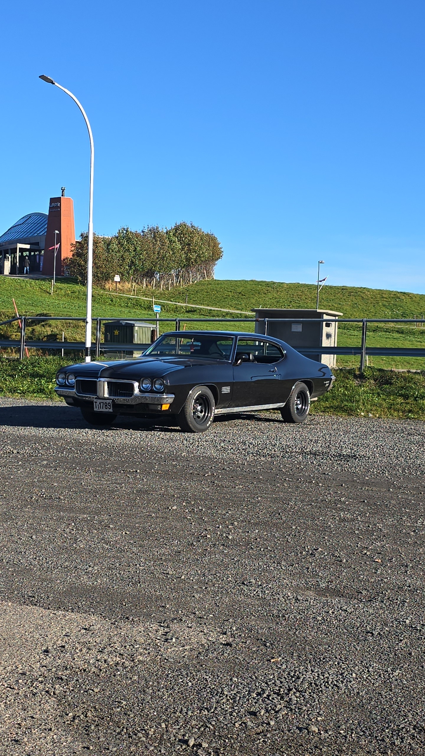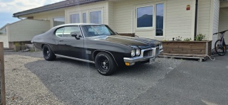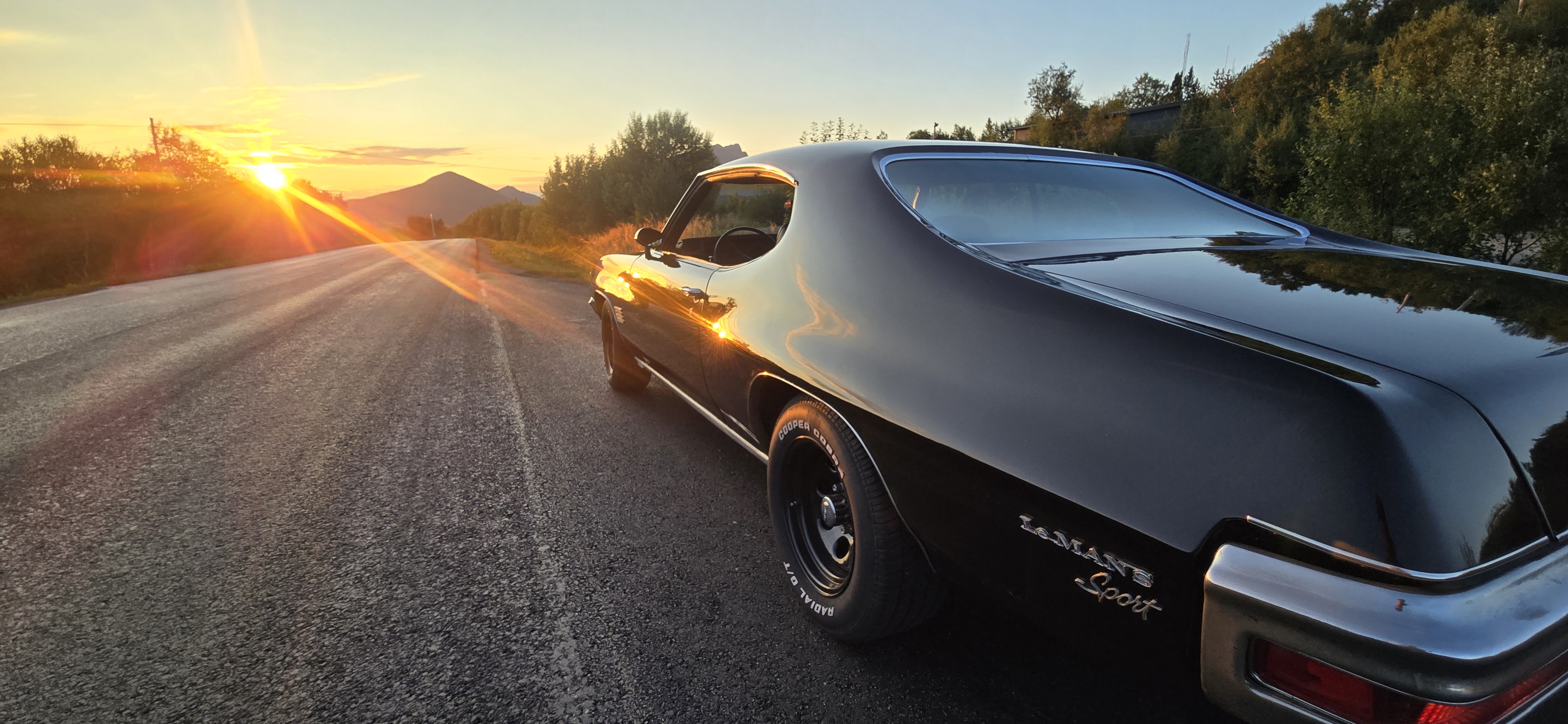 Bilen er en 1970 Pontiac LeMans Sport 2-Door Hardtop. Original 350 motor. Black on black, sort interiør, sort utvendig. Den ble importert til Norge fra California i 2011/2012. Og jeg er eier nummer 3 i Norge, nummer 5 totalt. Har hatt god kontakt med tidligere eiere i California, og har all dokumentasjon fra gamlelandet. Den var originalt blå, og har noen kule bilder fra bilen på midt 90-tall før eieren fikk den lakket om til sort.